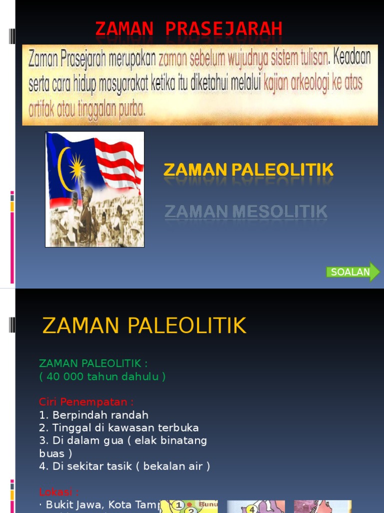 Kulit bumi masih sangat panas, karena masih dalam proses pembentukan. Zaman praaksara ditandai dengan belum ditemukannya tulisan. Kewujudan manusia prasejarah dapat diketahui melalui kajian 1 sejarah tahun 4: Zaman perkembangan prasejarah dunia terbahagi kepada empat peringkat iaitu zaman paleolitik, zaman mesolitik, zaman neolitik dan zaman logam. Bukit jawa, lenggong perak, gua niah, sarawak, zaman mesolitik: